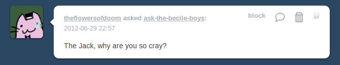[ID: The first image is a Tumblr ask from user “theflowersofdoom” asking, “The Jack, why are you so cray?”]