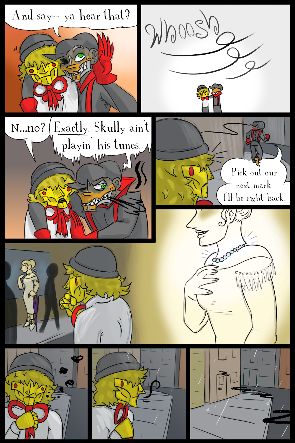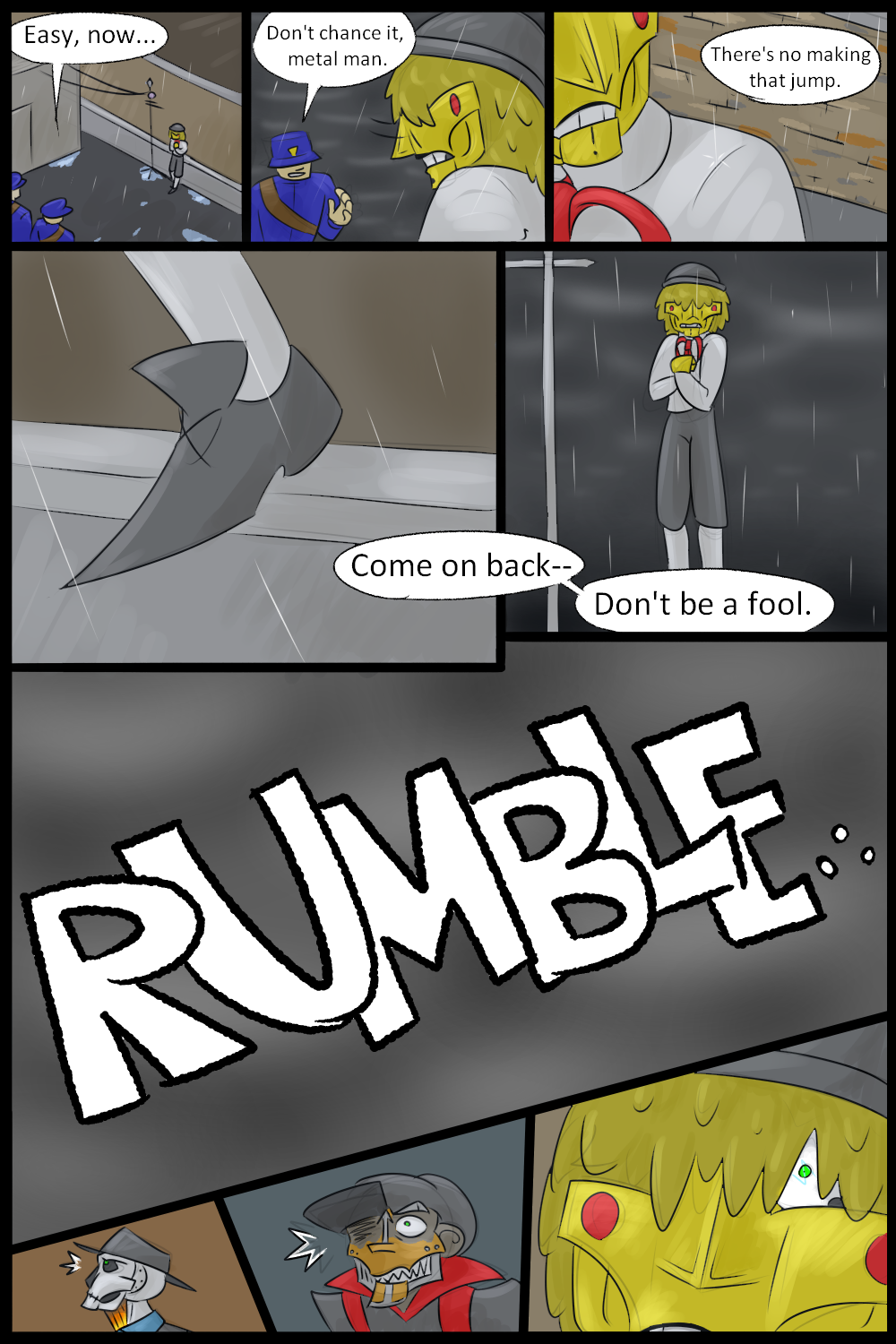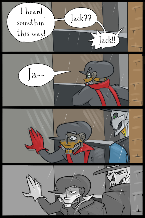 The second panel is an establishing shot of the downtown skyline. Storm clouds are rolling in and darkening the orange sky. The Jack says from offscreen, “Hehe! Yes, yes… quite the tumble.” The skinny man says from offscreen, “O-oh, I-”