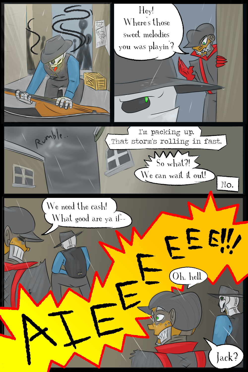 The third panel shows The Jack looking confused as Hare’s demeanor drops into a snarl, looking off to the side and spitting smoke. The Jack says, “N… no?” Hare says, “Exactly. Skully ain’t playin’ his tunes.”