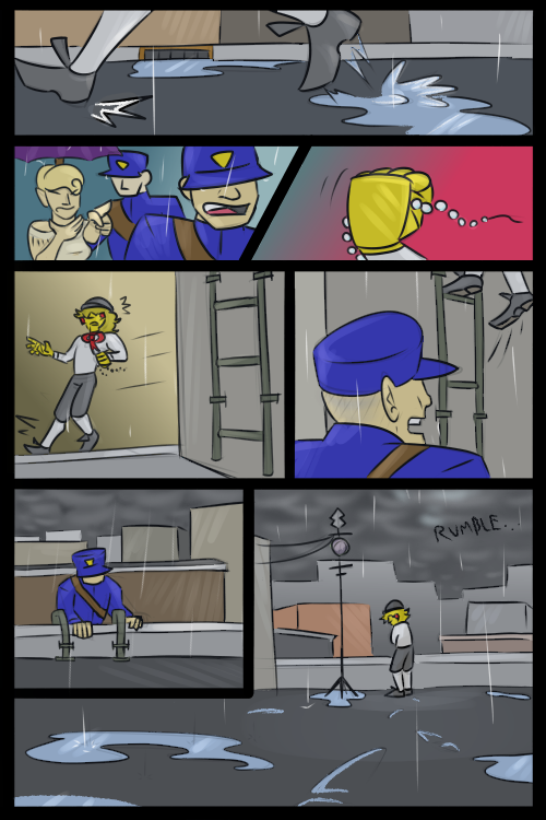 The seventh panel is the same shot, now with The Jack looking after where Hare went. It begins to rain.