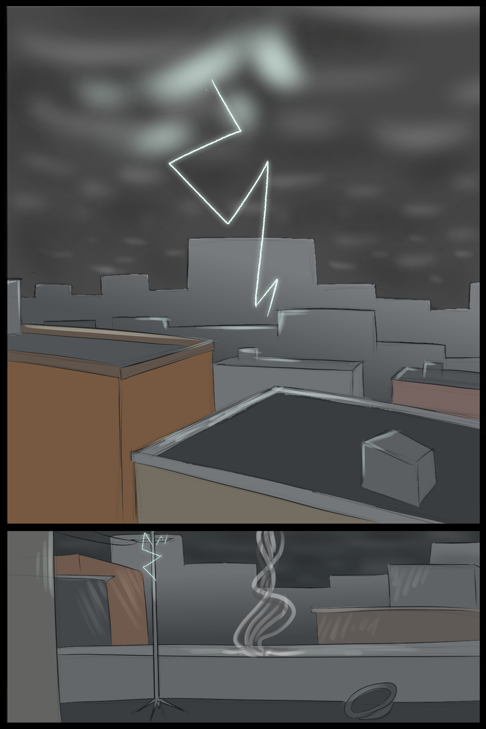 The first panel shows a wide shot of the roofs of downtown, leading out to the skyline. A giant bolt of lightning is striking in the middle of the page.