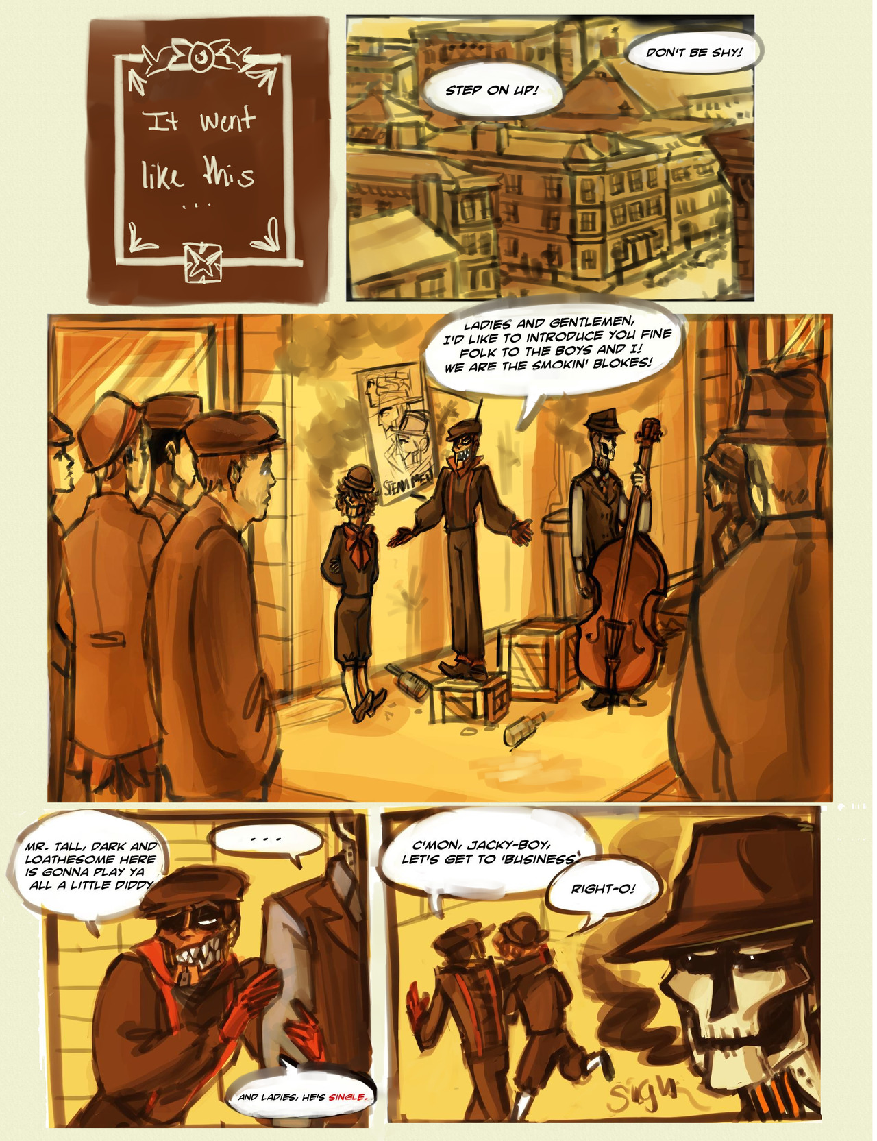The third panel is a group of people standing on the street looking at Hare, The Jack, and The Skull. Hare is standing on a wooden box, addressing the crowd. The Jack is standing to his right, watching the crowd, rocking on his heels, and blowing smoke. The Skull is standing to Hare’s left and steadying his double bass. Hare says, “Ladies and gentlemen, I’d like to introduce you fine folk to the boys and I! We are The Smokin’ Blokes!”