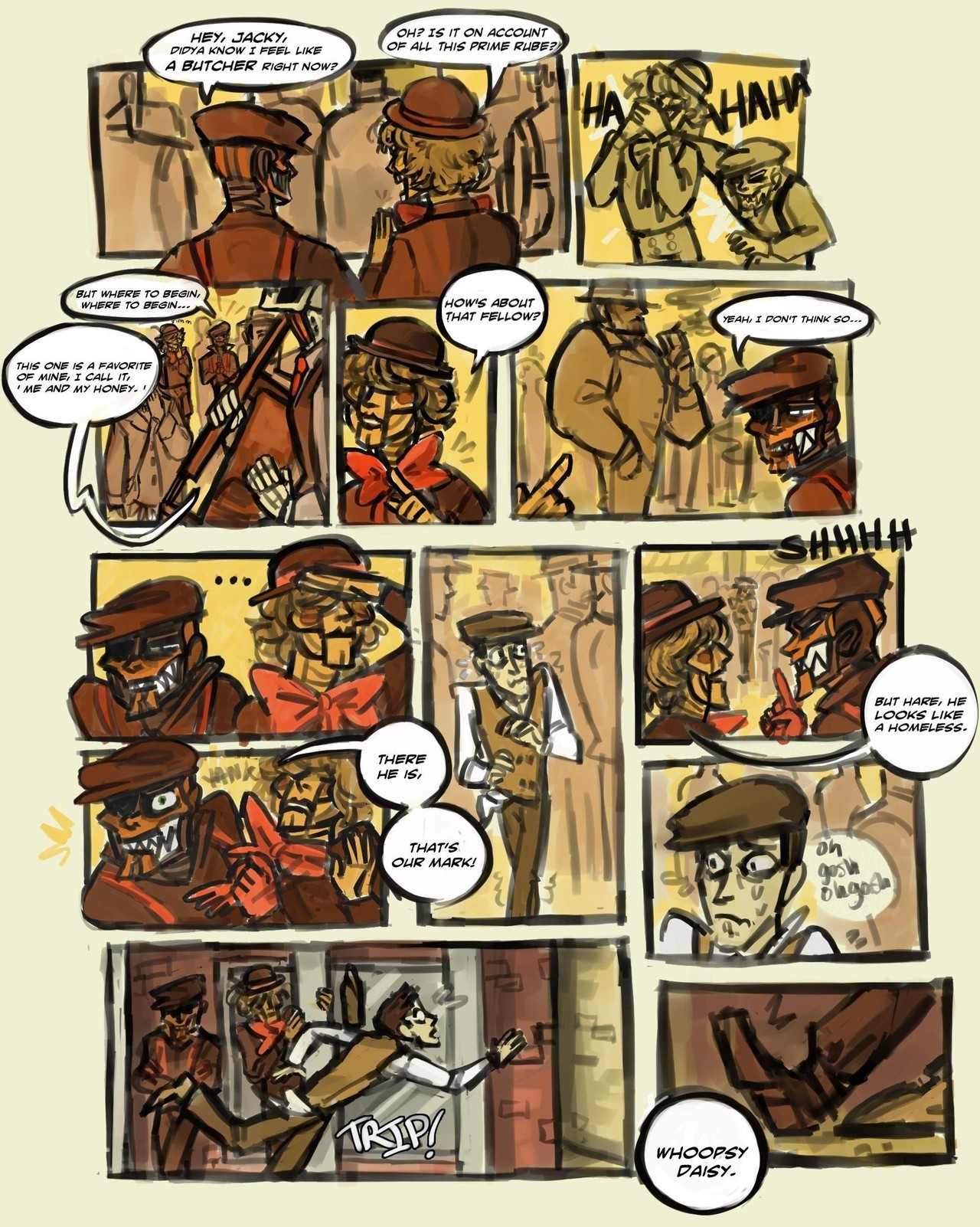 The sixth panel shows the skinny man backing up in fear and almost bumping into Hare, who is reaching to grab the man’s shoulder. The Jack says from offscreen, “Hehe… I don’t bite, mister.” End ID]