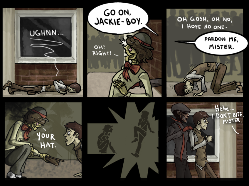 The fourth panel shows The Jack crouching in front of the skinny man, holding out the man’s dropped hat. The man is looking up at The Jack in surprise. The Jack says, “Your hat.”