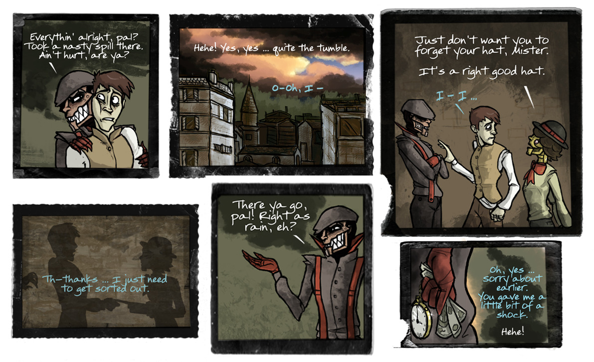 The fourth panel shows the shadows of the skinny man taking his hat back from The Jack and of Hare’s hand reaching for the man’s pocket. The man says, “Th-thanks… I just need to get sorted out.”