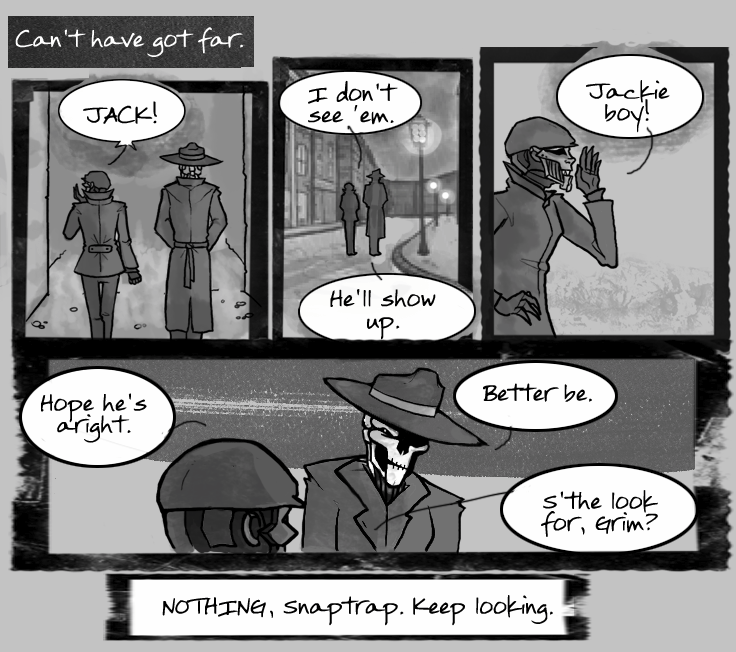 The fifth panel shows Hare and The Jack walking away, with Hare putting his arm around The Jack’s shoulders. Hare says, “C'mon, Jacky-boy, let’s get to 'business.’” The Jack replies, “Right-o!” The Skull glares after them with a sigh, blowing some smoke. End ID]
