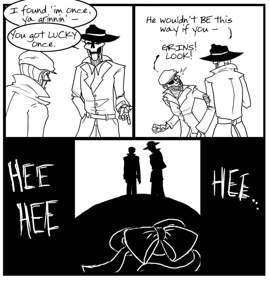 The third panel shows Hare and The Skull in silhouette, looking into darkness where The Jack’s signature bow is laying on the ground. From offscreen there is laughter, “Hee hee hee…” End ID]