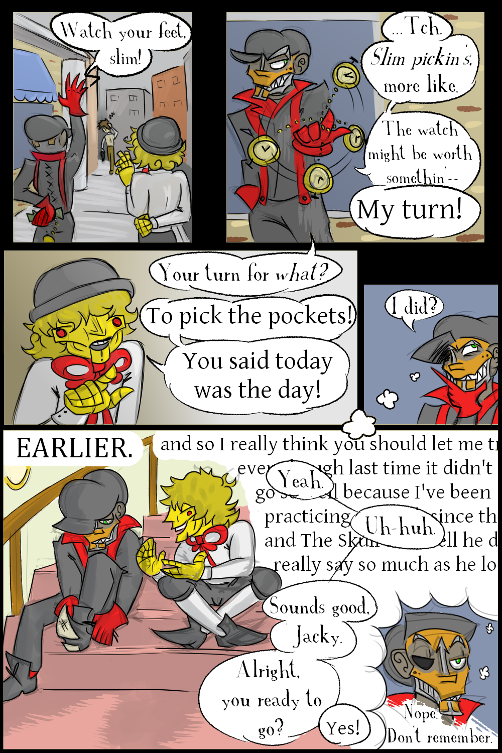 The fifth panel has a text bubble in the upper left corner that reads (all caps) earlier. It shows Hare and The Jack sitting on a flight of stairs in Becile Manor. The Jack is gesturing excitedly while Hare is focused on tying his shoe. The right of the panel is filled with The Jack’s speech which partially runs off the page, with Hare’s speech overlaid. The Jack’s text reads, “and so I really think you should let me tr- eve- -gh last time it didn’t go s- -ll because I’ve been practicing - since th- and The Skull -ell he d- really say so much as he lo-” Hare’s text is overlaid over The Jack’s and reads, “Yeah. Uh-huh. Sounds good, Jacky. Alright, you ready to go?” The Jack says, “Yes!”