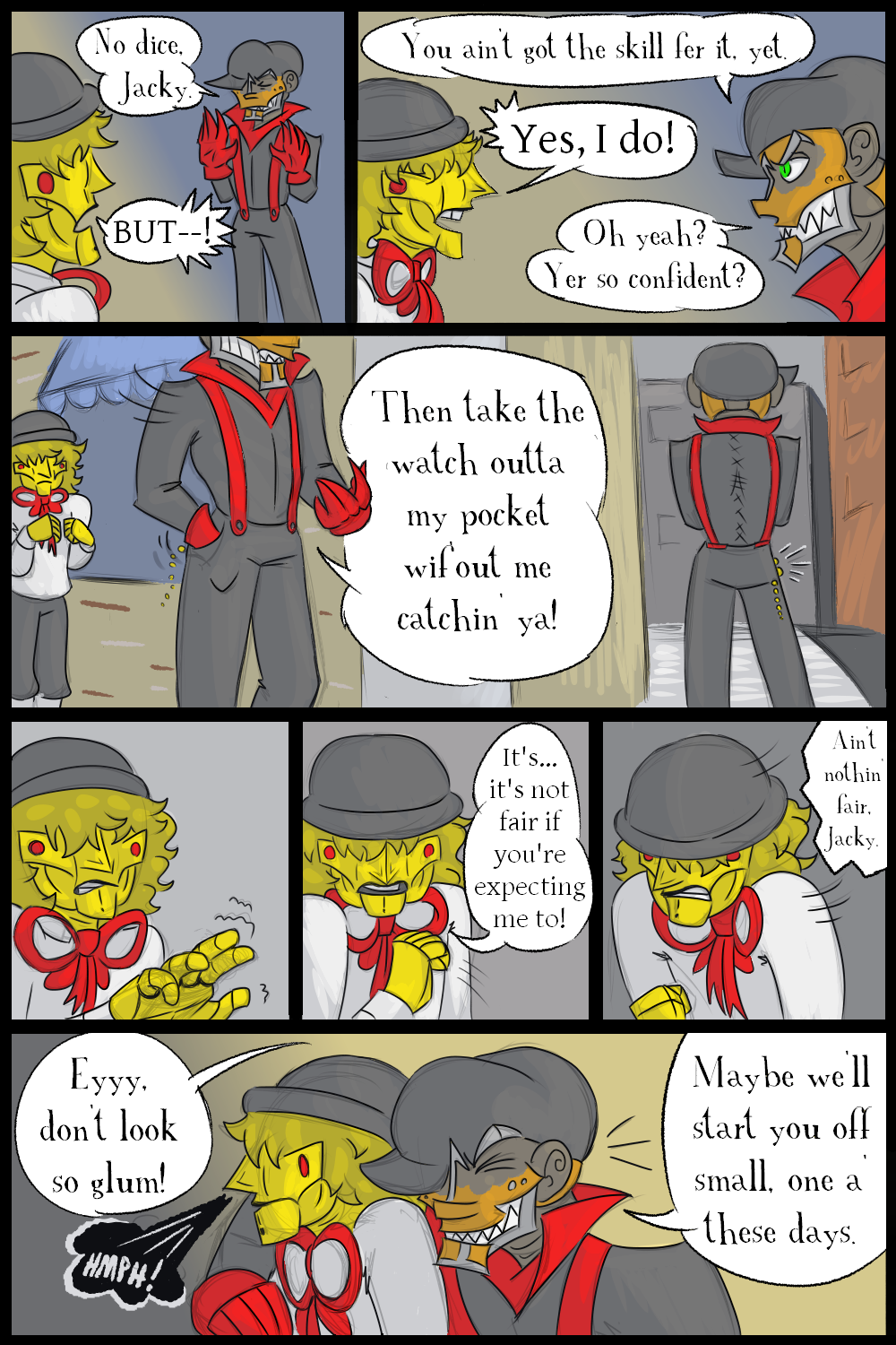 In the seventh panel, Hare puts his arm around Jack’s shoulder companionably while grinning. The Jack snorts out a cloud of smoke huffily. SFX: Hmph!“ Hare says, "Eyyy, don’t look so glum! Maybe we’ll start you off small, one a’ these days.” End ID]